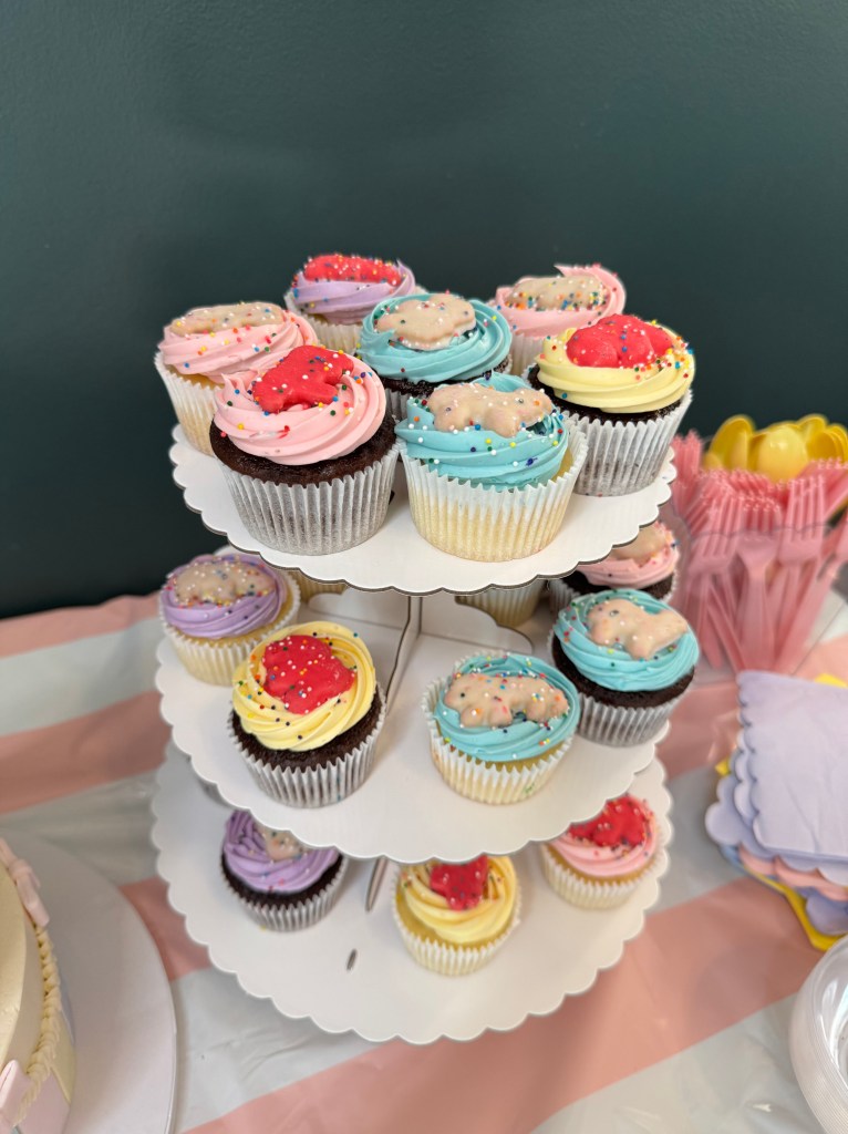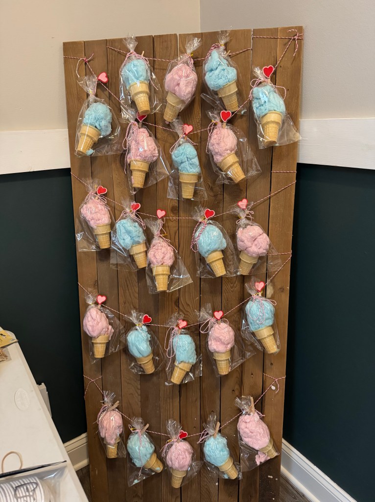 This wood pallet I found in my garage from another event. I wanted a unique way to display cotton candy. I played around with some string and placed this right next to the dessert table. Which held the most delicious Confetti Cake with vanilla icing and animal cracker pastel cupcakes.